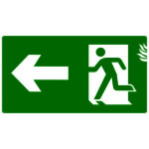 Placa de sinalização fotoluminescente indicativa de rota de fuga esquerda em pvc expandido, com dimensões: 30 CM X 15 CM